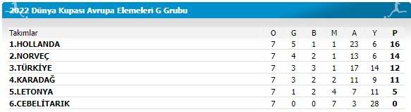 Türkiye oynadığı 7 maçta 3 galibiyet, 3 beraberlik ve mağlubiyet aldı. Ay-yıldızlılar 12 puanla 3.sırada yer alıyor. G Grubu'nda 16 puanlı Hollanda lider, 14 puanlı Norveç ise ikinci sırada bulunuyor. Türkiye'nin grupta kalan 3 maçını da kazanması gerekiyor. Ayrıca Hollanda'nın en az 4, Norveç'in ise 2 puan kaybetmesi gerekiyor. Play-off turu içinse grubun ikinci tamamlanması gerekli. Bunun içinse Türkiye'nin 9 puan alıp Norveç'in 3 puan kaybetmesi yeterli olacak. Şayet bu süreçte Norveç 2 puan kaybederse bu kez averajlara bakılacak.