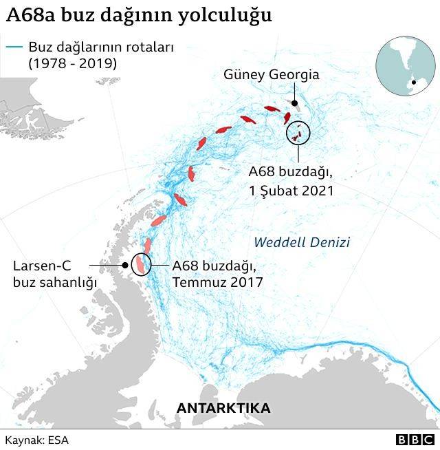 A68, kısa bir süre öncesine kadar dünyanın en büyük buzdağıydı. 2017'de Antarktika'dan ayrıldığında yaklaşık 6 bin km2'lik bir alanı kaplıyordu. Ancak 2021'in başlarında ortadan kaybolmuştu. Bir trilyon ton buzun tamamı eridi.