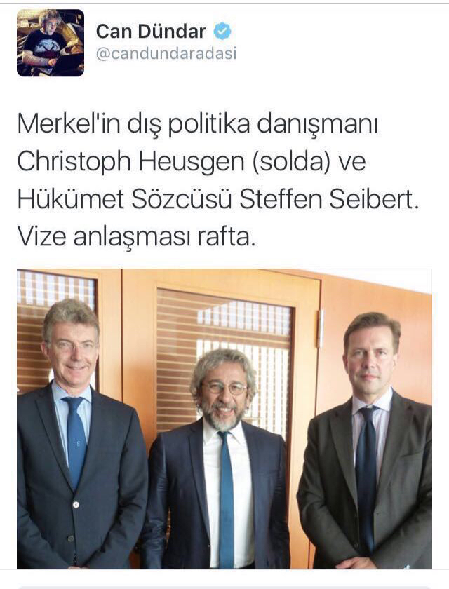 Almanya Başbakanı Merkel'in danışmanı ve hükümet sözcüsüyle bir araya gelen vatan haini Can Dündar, AB ile vize anlaşmasının rafa kaldırılmasına bir hayli sevindi.