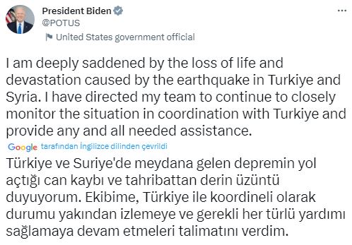 ABD Başkanı Joe Biden, Kahramanmaraş başta olmak üzere Gaziantep, Adıyaman, Hatay, Şanlıurfa, Malatya, Osmaniye gibi birçok ilimizde büyük yıkıma neden olan depreme ilişkin ekibine Türkiye'yle koordine olup gerekli her türlü yardımı sağlamaya devam etmeleri talimatını verdiğini söyledi.