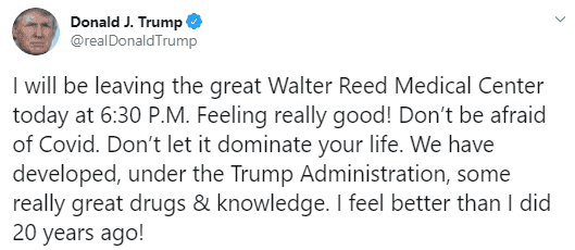Trump, sosyal medya hesabından yaptığı paylaşımda, bugün yerel saatle 18.30’da Walter Reed Ulusal Askeri Hastanesinden taburcu olacağını duyurdu. Başkan Trump, “Bugün saat 18.30’da harika Walter Reed Tıp Merkezi’nden ayrılıyor olacağım. Kendimi gerçekten iyi hissediyorum! Covid’den korkmayın. Hayatınıza hakim olmasına izin vermeyin. Trump yönetimi altında gerçekten harika ilaçlar ve bilgiler geliştirdik. 20 yıl öncesine göre daha iyi hissediyorum!” dedi.