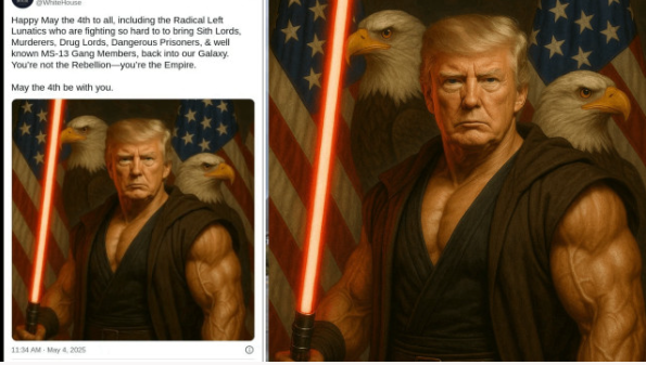 Beyaz Saray'ın X hesabından, ülkede gayri resmi olarak kutlanan Yıldız Savaşları Günü nedeniyle yapılan paylaşımda, Trump, Yıldız Savaşları filmlerini anımsatan bir film posterindeki baş kahraman olarak gösterildi.