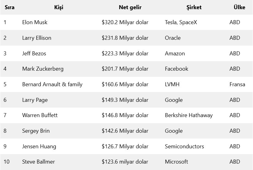 ABD’nin büyük teknoloji devleri ve Avrupa’nın lüks tüketim markaları listede öne çıkarken, Musk’ın başı çektiği teknoloji milyarderleri listede ağırlığını hissettiriyor. Bununla birlikte tablodan da görebileceğiniz üzere, listeyi Amerika Birleşik Devletleri bünyesinde bulunan iş insanları domine etmiş durumda…