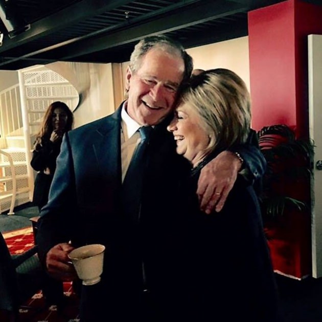 Fotoğrafta ABD eski başkanlarından George W. Bush ile ABD eski dışişleri bakanlarından Hillary Clinton kucaklaşarak, samimi bir görüntü veriyor. Bush bir kolunu Clinton'ın omzuna atmış, diğer elinde kahve var. Clinton ise başını hafif şekilde Bush'un omzuna koymuş ve ikisi kahkaha atıyor.