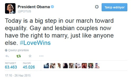 ABD Başkanı Barack Obama da konuyla ilgili bir tweet paylaştı. Obama, “Bugün eşitliğe doğru yürüyüşümüzde büyük bir adım. Gay ve lezbiyen çiftler artık herkes gibi evlenebilecek” yazdı ve tweetinin sonunaingilizce 'aşk kazanır' yazarak sapkınlığa verdiği desteği göstermiş oldu.