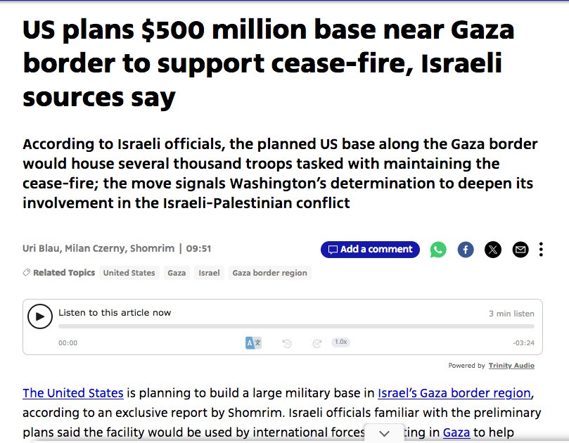 Syonist Yedioth Ahronoth gazetesinin haberine göre ABD, İsrail’in Gazze sınır bölgesinde büyük bir askeri üs inşa etmeyi planlıyor. Ön planlara aşina olan İsrailli yetkililer, tesisin Gazze’de faaliyet gösteren uluslararası güçler tarafından ateşkesi korumak için kullanılacağını ve birkaç bin askeri barındırabileceğini söyledi .
