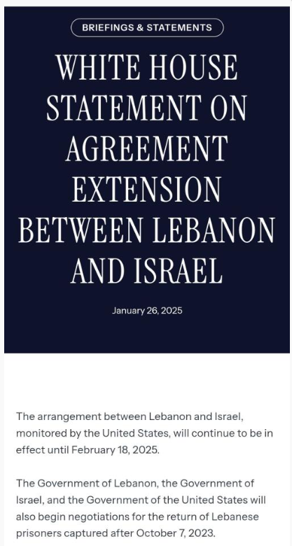 ABD hükümeti, Lübnan ve İsrail arasında varılan ateşkes anlaşmasının süresinin 18 Şubat 2025’e kadar uzatıldığını açıkladı.