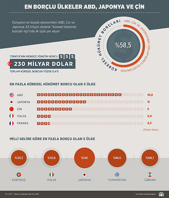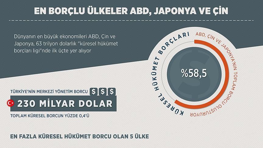 Uluslararası Para Fonu (IMF) verilerine göre, dünyadaki hükümetlerin toplam borcu 63 trilyon dolara denk geliyor. ABD, Çin ve Japonya'nın toplam borcu, küresel hükümet borçların yüzde 58,5'ini oluşturuyor.