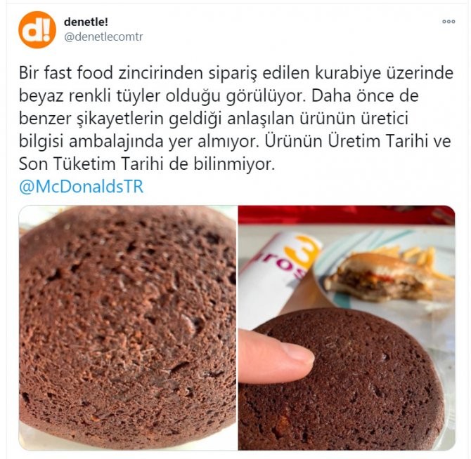Fotoğraflar “Bir fast food zincirinden sipariş edilen kurabiye üzerinde beyaz renkli tüyler olduğu görülüyor. Daha önce de benzer şikayetlerin geldiği anlaşılan ürünün üretici bilgisi ambalajında yer almıyor. Ürünün Üretim Tarihi ve Son Tüketim Tarihi de bilinmiyor” mesajıyla paylaşıldı.