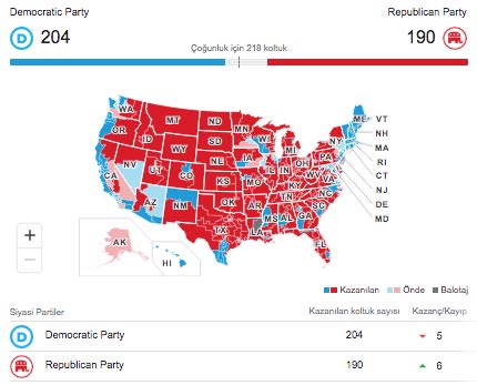 ABD seçim sonucu resmi olmayan sonuçlara göre, Cumhuriyetçiler Temsilciler Meclisinde çoğunluğu elde etti. Cumhuriyetçiler Temsilciler Meclisinde 48 koltuğa sahip olurken Demokratlar 46 sandalyeye sahip.