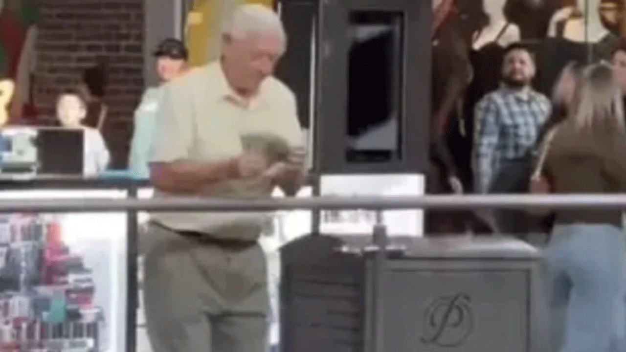 Sosyal medyada kısa sürede viran olan görüntüde, yaşlı bir adam AVM'nin üst katına çıktı.
