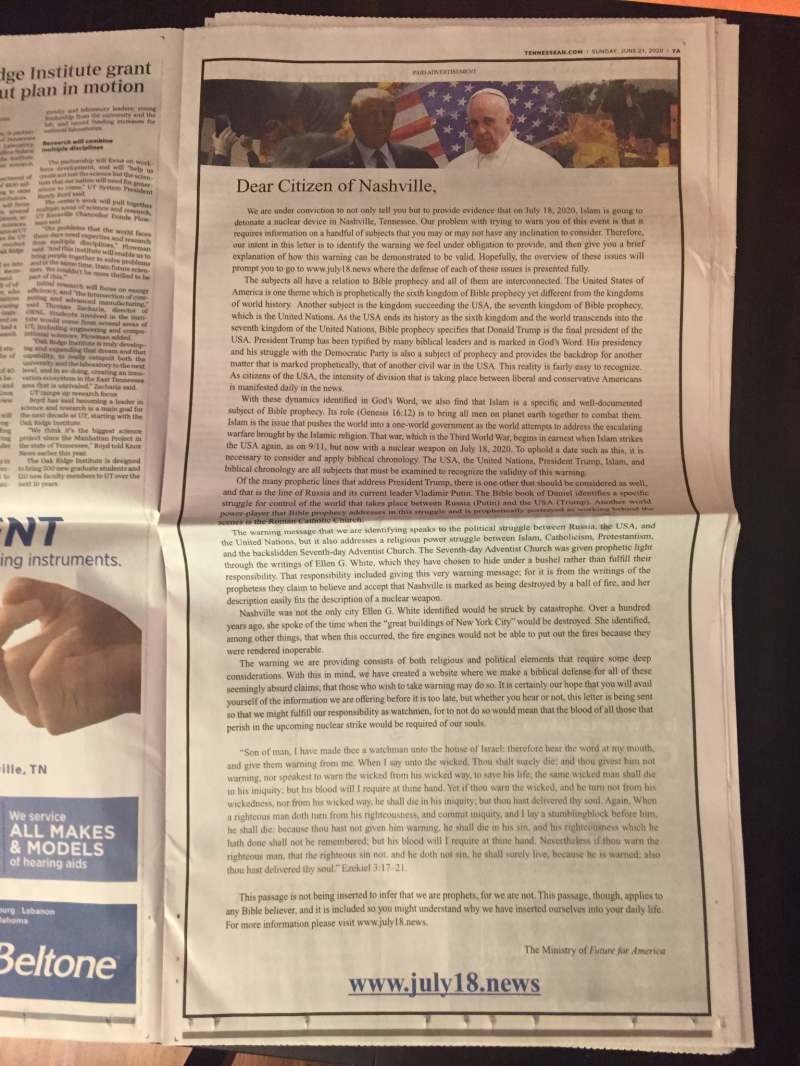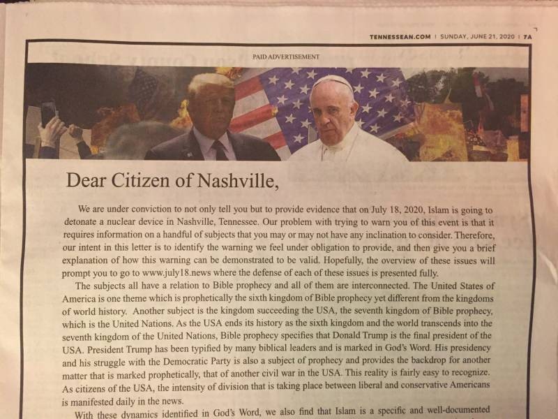 Eyaletin en yüksek tirajlı gazetesi The Tennesseean'da tam sayfa yayımlanan ilanda, eyaletin başkenti Nashville'in “İslam tarafından yaklaşmakta olan bir nükleer saldırı altında olduğu” iddia edildi.
