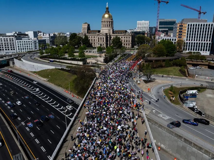 Başkent Washington D.C.'de sabah saatlerinde başlayan "DC'ye Yürüyüş" eyleminde binlerce kişi Memorial Köprüsü'nden Washington Anıtı'na kadar yürüdü. Protestocular özellikle 28 Şubat'ta başlayan ve Orta Doğu’yu yangın yerine çeviren ABD-İsrail’in İran saldırılarını sert bir dille eleştirdi. New York'ta ise Times Meydanı'na yürüyen binlerce kişi, "Epstein dosyalarında değilsen korna çal" ve "Küba ablukasına hayır" yazılı pankartlarla dikkat çekti.