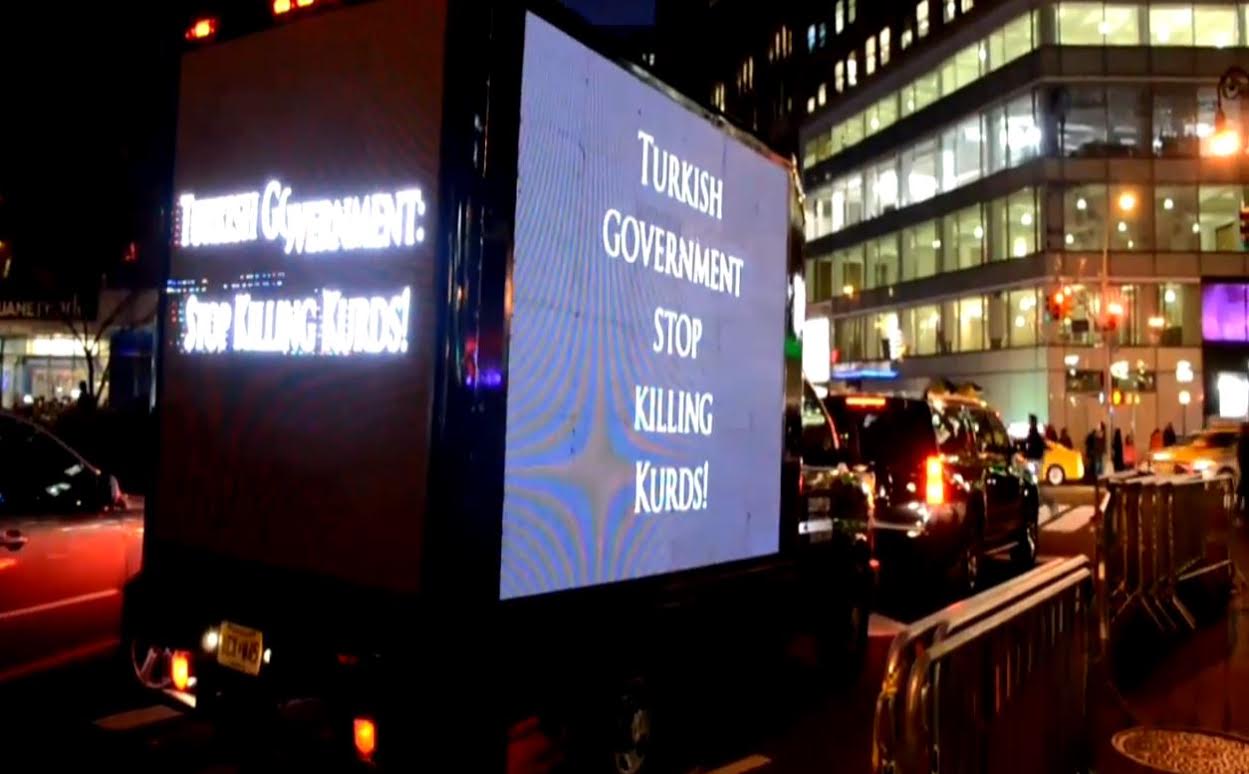 Bölücü terör örgütü PKK’nın ABD’de örgütlenerek Türkiye karşıtı diaspora faaliyetleri yürüten ihanetçi Halkların Demokratik Kongresi tarafından Türkiye’nin terörle mücadelesine gölge düşürmek için yeni bir kampanya başlatıldı. Terör örgütü PKK’nın son sığınağı olan Güneydoğu’daki şehir merkezlerinden temizlenmesi amacıyla başlatılan süpürme operasyonuyla köşeye sıkışan ihanetçiler, çareyi tuttukları üç tarafı dev LED ekranlarla kaplı kamyonlarla PKK’nın yalanlarını Amerikan halkına anlatmakta buldu.
