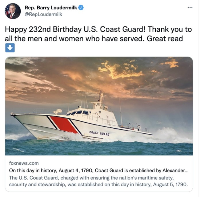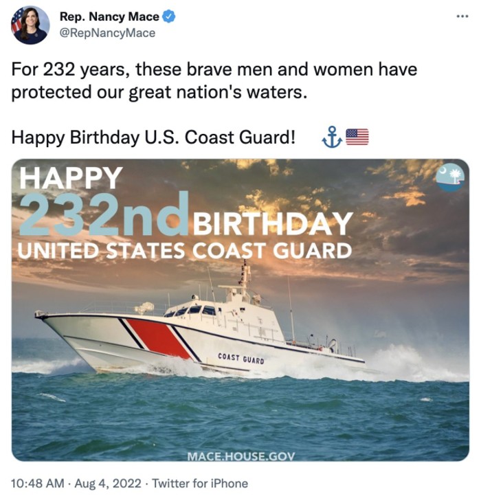 ABD Temsilciler Meclisi Üyesi Nancy Mace'de ABD Sahil Güvenlik Komutanlığı'nın 232. yıl dönümüne özel sosyal medya hesabından paylaşım yaptı.