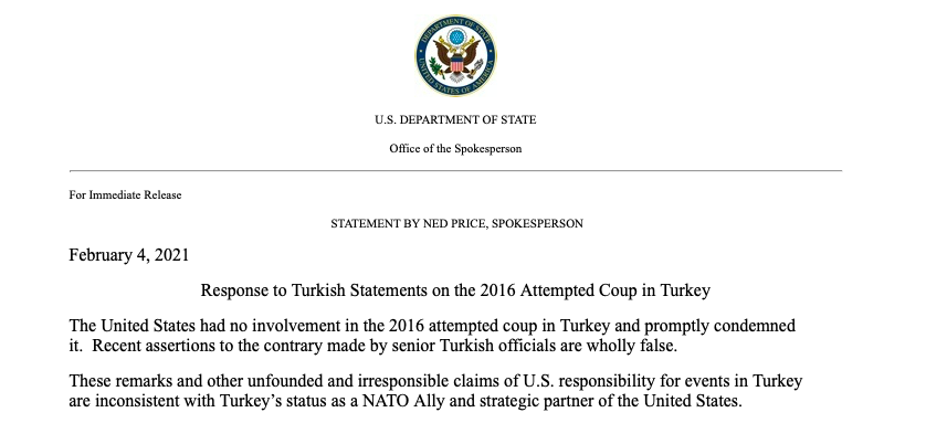 ABD Dışişleri Bakanlığı Sözcüsü Ned Price, Türkiye İçişleri Bakanı Süleyman Soylu'nun, Washington'un 15 Temmuz 2016'da gerçekleştirilen darbe girişiminde rolü olduğu yönündeki suçlamasını reddetti.
