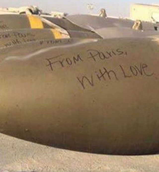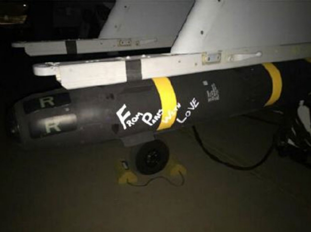 Ayrıca operasyonlar öncesi IŞİD'e atılmak üzere ABD jetlerine yüklenen bombalara "From Paris, with love" yani