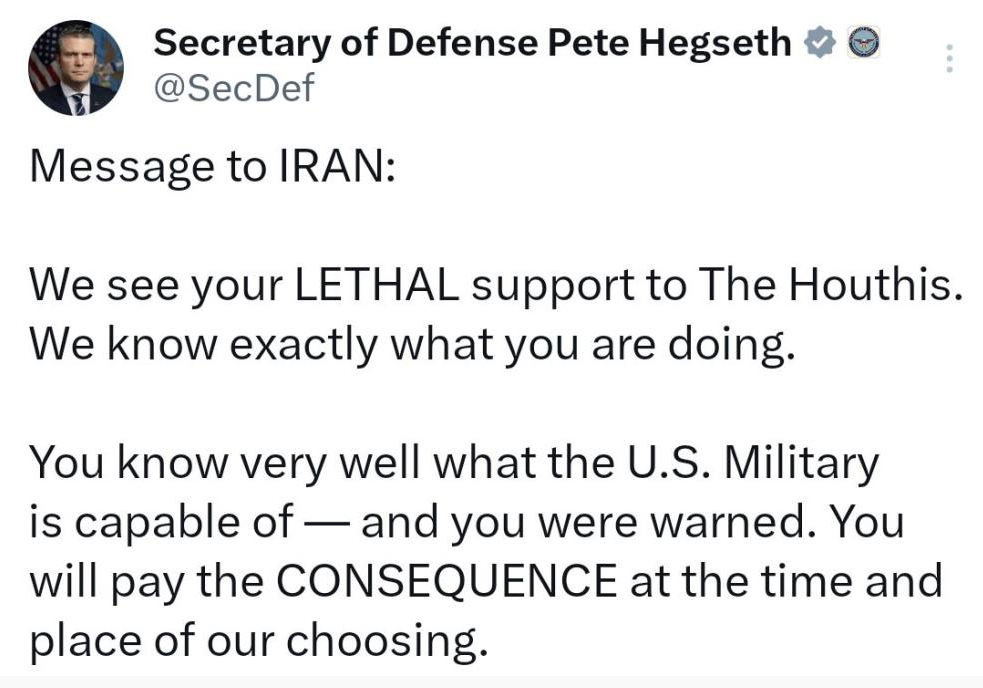 ABD Savunma Bakanı Pete Hegseth, İran’ın Yemen’deki Husilere verdiği desteğin cezasız kalmayacağını belirterek, "Sonuçlarına, bizim seçeceğimiz zaman ve yerde katlanacaksınız" uyarısında bulundu