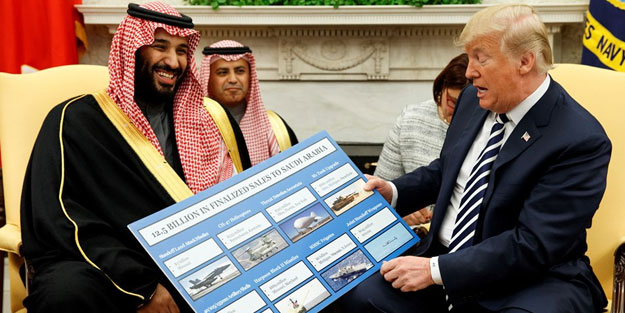 Suudi Arabistan'ın ABD'den aldığı milyarlarca dolarlık silah sistemini eski ABD Başkanı Donald Trump, basın mensuplarına, üzerinde Suudi Arabistan'a son dönemde satılan 12,5 milyar dolarlık silahların olduğu karton bir panoyu da göstermişti.