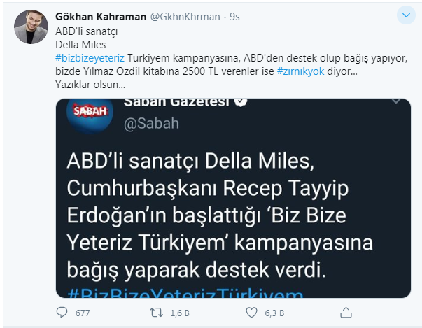 ABD’li sanatçı Della Miles, Cumhurbaşkanı Recep Tayyip Erdoğan’ın başlattığı ‘Biz Bize Yeteriz Türkiyem’ kampanyasına bağış yaparak destek verdi. Twitter’da Della Miles yoğun ilgi görürken, kampanyaya katılmayıp hükümeti hedef alanlar, ‘Biz bize yeteriz Türkiyem kampanyasına, ABD'den destek olup bağış yapıyor, bizde Yılmaz Özdil kitabına 2500 TL verenler ise zırnık yok diyor. Yazıklar olsun...’ ifadeleri ile eleştirildi.