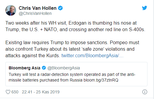 Türkiye'ye Suriye harekatı nedeniyle sert eleştirilerde bulunan ve bir yaptırım tasarısı hazırlayan iki isimden biri olan Demokrat Senatör Chris Van Hollen, Twitter hesabından Türkiye'nin S-400'leri test ettiği haberini paylaştı ve, "Erdoğan, Trump'a nanik yapıyor" dedi.