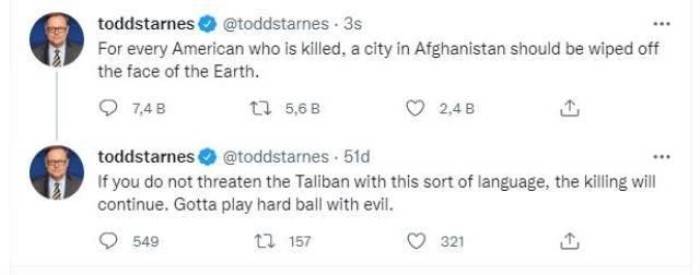 Gelen tepkiler üzerine ikinci bir paylaşım yapan Starnes, "Eğer Taliban'ı bu tür bir dille tehdit etmezseniz, cinayetler devam edecek. Kötülükle acımasız bir şekilde mücadele edilmeli." dedi.