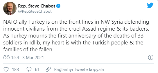 ABD'de Cumhuriyetçi vekil Steve Chabot, İdlib'te şehit 33 asker için taziye mesajını iletirken, NATO müttefiki Türkiye'nin Esad ve destekçilerinin önünde duran ve masumları savunan bir ülke olduğunu söyledi.