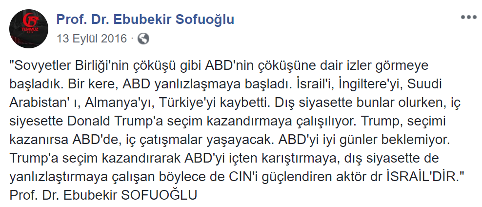 Prof. Ebubekir Sofuoğlu, 13 Eylül 2016’da, ABD’de çöküşün başladığını, Trump’ın başkanlık seçimlerini kazanması durumunda ülkede iç çatışmalar olacağını, ve küresel eşkıyanın dış siyasette yalnızlaşacağını belirmişti.