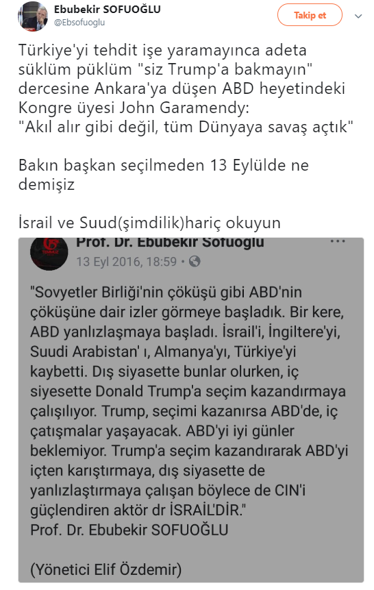 “Türkiye'yi tehdit işe yaramayınca adeta süklüm püklüm "siz Trump'a bakmayın" dercesine Ankara'ya düşen ABD heyetindeki Kongre üyesi John Garamendy: "Akıl alır gibi değil, tüm Dünyaya savaş açtık" Bakın başkan seçilmeden 13 Eylülde ne demişiz. İsrail ve Suud(şimdilik)hariç okuyun”