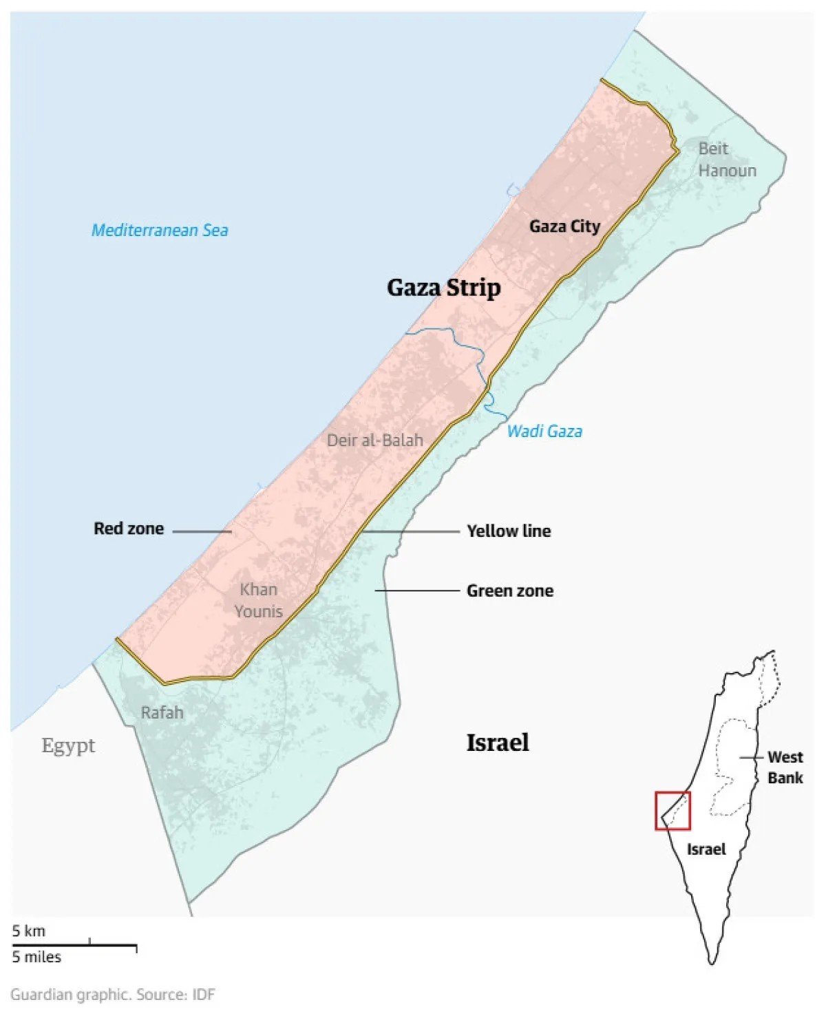İngiliz basını ABD Merkez Kuvvetler Komutanlığı belgelerine dayandırdığı habere göre, ABD’nin Gazze Şeridi’ni kırmızı ve yeşil olmak üzere iki bölgeye ayırmayı planladığı iddia edildi. Plana göre, yeşil bölgede uluslararası güçler kontrolünde yeniden inşa başlatılacak; Hamas’ın kontrolündeki kırmızı bölge ise harabe (enkaz) olarak kalacak.