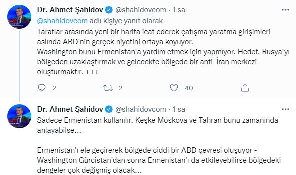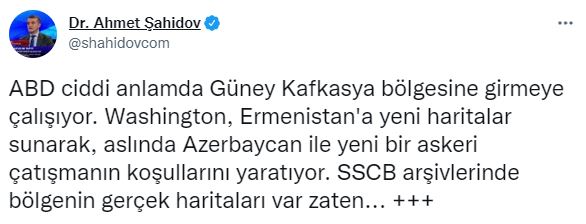 Şahidov paylaşımında, “ABD ciddi anlamda Güney Kafkasya bölgesine girmeye çalışıyor. Washington, Ermenistan'a yeni haritalar sunarak, aslında Azerbaycan ile yeni bir askeri çatışmanın koşullarını yaratıyor. SSCB arşivlerinde bölgenin gerçek haritaları var zaten. Taraflar arasında yeni bir harita icat ederek çatışma yaratma girişimleri aslında ABD'nin gerçek niyetini ortaya koyuyor. Washington bunu Ermenistan'a yardım etmek için yapmıyor. Hedef, Rusya'yı bölgeden uzaklaştırmak ve gelecekte bölgede bir anti İran merkezi oluşturmaktır. Sadece Ermenistan kullanılır. Keşke Moskova ve Tahran bunu zamanında anlayabilse... Ermenistan'ı ele geçirerek bölgede ciddi bir ABD çevresi oluşuyor - Washington Gürcistan'dan sonra Ermenistan'ı da etkileyebilirse bölgedeki dengeler çok değişmiş olacak” ifadelerini kullandı.