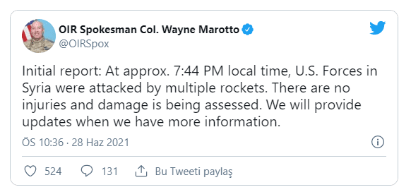 Doğal Kararlılık Operasyonu'nun sözcüsü Marotto, Twitter üzerinden yaptığı açıklamada, "İlk rapor: Yerel saatle yaklaşık 19:44'te Suriye'deki ABD Kuvvetleri birden fazla roketle saldırıya uğradı" ifadelerini kullandı.