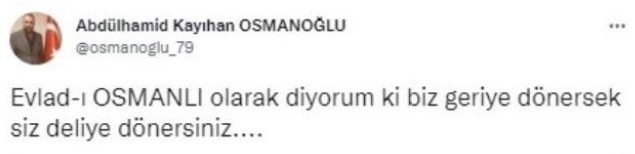 Sultan II. Abdulhamid Han'ın torunu Abdülhamid Kayıhan Osmanoğlu, İYİ Parti Genel Başkanı Meral Akşener'e sosyal medya hesabından tokat gibi bir cevap verdi. Haddini aşarak Abdulhamid Han'a dil uzatan Akşener'e ayar veren Osmanoğlu, "Evlad-ı Osmanlı olarak diyorum ki biz geriye dönersek siz deliye dönersiniz" dedi.