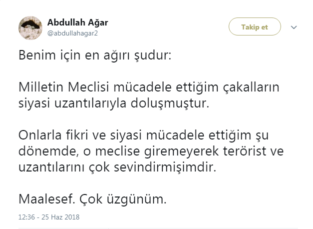 24 Haziran'da yapılan Cumhurbaşkanlığı ve Milletvekili seçimlerinde MHP'den Ankara milletvekili adayı olan Abdullah Ağar, “mücadeleettiğim terörist ve uzantılarını meclise giremeyerek sevindirmişimdir, çok üzgünüm” dedi.