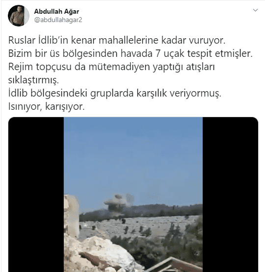 Bugün Rusya'nın İdlib'e saldırısına ilişkin sosyal medyada paylaşım yapan Terör ve Güvenlik Uzmanı Abdullah Ağar, ‘bizim bir üs bölgesinden havada 7 uçak tespit etmişler’ ifadelerini kullandı.