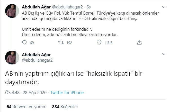 AB Yüksek Temsilcisi Josep Borrel, yaptığı açıklamada "gemi gibi varlıkların hedef alınabileceğini" açıklaması üzerine Terör ve Güvenlik Uzmanı Abdullah Ağar tepki gösterdi.