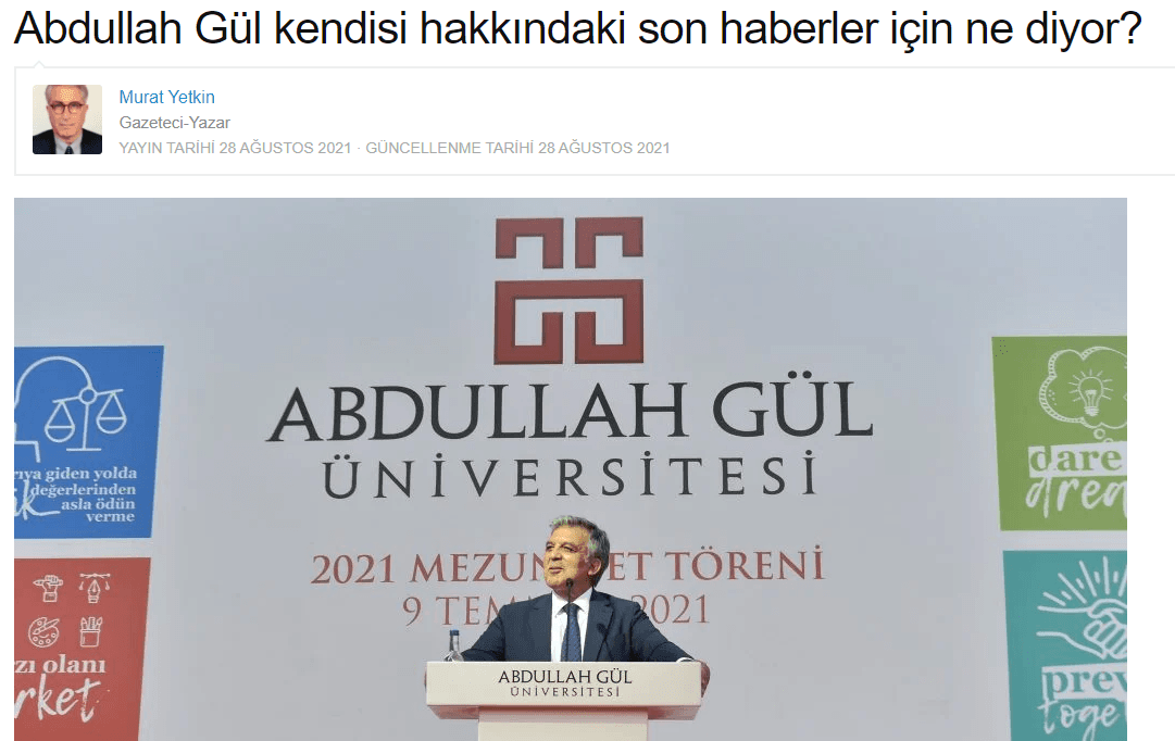 Yazısında, "Abdullah Gül kendisi hakkındaki son haberler için ne diyor?" başlığını kullanan Yetkin, "O günlerde Türkiye’nin orman yangınlarıyla kavrulup sellerle boğuşmasına ve Afganistan gibi dünya çapında ve Türkiye’yi fena halde ilgilendiren bir kriz patlamasına rağmen bu yayınlar ses getirdi. Daha çok iktidara yakın kanallarda ama muhalefete yakın kanallarda da yer buldu, tartışıldı. Bu tartışmaların özellikle de CHP lideri Kemal Kılıçdaroğlu’nun İstanbul Büyükşehir Belediye Başkanı Ekrem İmamoğlu ve Ankara Büyükşehir Belediye Başkanı Mansur Yavaş’ın Cumhurbaşkanlığı adaylığından yana olmadığını söylediği sıralarda alevlenmesi de dikkat çekiyordu." ifadelerini kullandı.