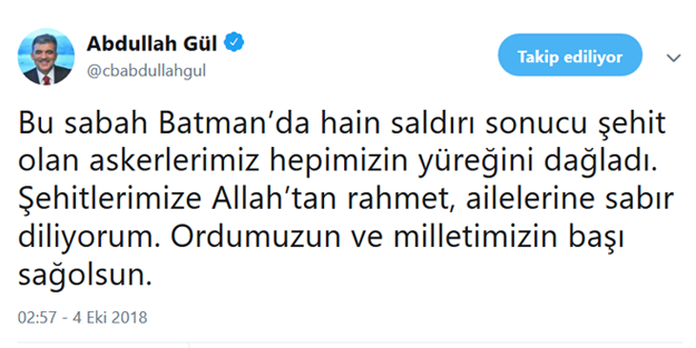 “Bu sabah Batman’da hain saldırı sonucu şehit olan askerlerimiz hepimizin yüreğini dağladı. Şehitlerimize Allah’tan rahmet, ailelerine sabır diliyorum. Ordumuzun ve milletimizin başı sağolsun.”