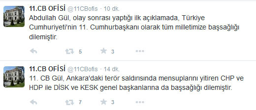 Gül’ün ofisinin resmi Twitter hesabından ise Davutoğlu’na cevap olarak, “11. CB Gül, Ankara'daki terör saldırısında mensuplarını yitiren CHP ve HDP ile DİSK ve KESK genel başkanlarına da başsağlığı dilemiştir. Abdullah Gül, olay sonrası yaptığı ilk açıklamada, Türkiye Cumhuriyeti'nin 11. Cumhurbaşkanı olarak tüm milletimize başsağlığı dilemiştir.” denildi.