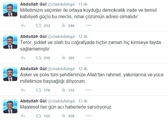 11.Cumhurbaşkanı Abdullah Gül, son günlerde yaşanılan terör saldırıları ve şehit haberleri karşısında Twitter adresinden durum değerlendirmesi yaptı. "Malesef her gün acı haberlerle sarsılıyoruz" diyen Abdullah Gül, şunları söyledi: