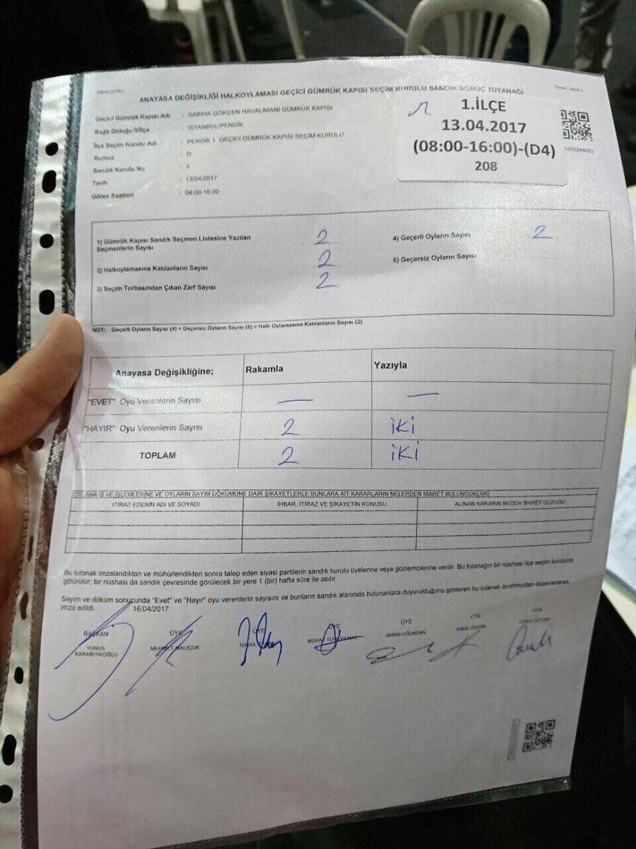 Abdullah Gül'ün, İngiltere'de yaşayan oğlu Mehmet Emre Gül'ün, 13 Nisan'da Sabiha Gökçen Havalimanı'nda oy kullandığı sandığın tutanağı ortaya çıktı. Tutanakta, yalnızca 2 oyun kullanıldığı anlaşılan sandıktan, 2 oyun da hayır yönünde kullanıldığı belli oldu.