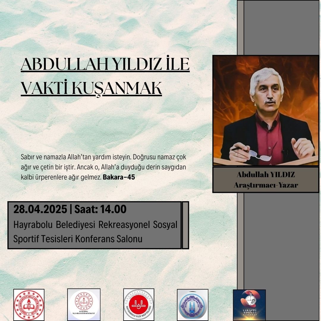 Araştırmacı-Yazar Abdullah Yıldız, "Vakti Kuşanmak" temalı programla Hayrabolu’da dinleyicilerle buluşacak.