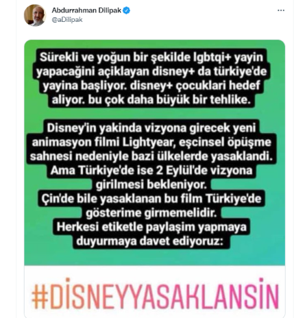Twitter hesabından paylaşım yapan Dilipak, Disney'in 2 Eylül'de Türkiye'de gösterime sunacağı, "Lightyear" adlı animasyon filmi için kamuoyunu uyardı.