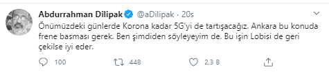 Abdurrahman Diliapak, yaptığı paylaşımda, "Önümüzdeki günlerde Korona kadar 5G'yi de tartışacağız. Ankara bu konuda frene basması gerek. Ben şimdiden söyleyeyim de. Bu işin Lobisi de geri çekilse iyi eder" ifadelerini kullandı.