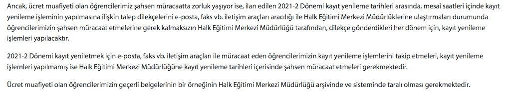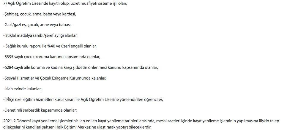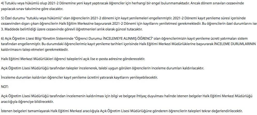 2) Halen örgün eğitimde e-Okulda aktif olarak kayıtlı olan öğrencilerin e okul sistemi üzerinden dönem atlatma işlemlerinin 4-6 Şubat 2022 tarihleri arasında yapılacağından, söz konusu öğrencilerden Açık Öğretim Lisesine geçiş yapmak isteyenlerin yeni kayıt iş ve işlemleri 07 Şubat 2022 - 11 Şubat 2022 tarihleri arasında yapılacaktır. Halk eğitimi merkezi müdürlükleri ve yüz yüze eğitim kurumlarında yoğunluk oluşmaması adına, kayıtlar tüm öğrenciler için 11 Şubat 2022 tarihi mesai bitimine kadar uzatılmıştır.