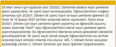 2020/1. Döneminde alınan kayıtların sınavları malumunuz olduğu üzere, 5-6 Aralık 2021 tarihlerinde yapılacaktı. Ancak salgın (Covid-19) nedeniyle ertelenmişti. 25 Şubat 2021 tarihinde başlayacak olan 2020/1. Dönem sınavı (çevrimiçi) ile 25 Mart 2021 tarihinde başlayacak olan 2020/2. Dönem sınavı (çevrimiçi) arasındaki sürenin; 2020/2. Dönem yeni (ilk) kayıtları almak için çok kısıtlı olmasından nedeniyle (2020/2. Dönemde alınması gereken yeni (ilk) kayıtlar) 2020/1. Dönem kayıtları tekrar açılarak 22 Ocak-15 Şubat 2021 tarihleri arasında alınacaktır. Sınavlar arasındaki sürenin kısıtlı olmasından dolayı, 2020/2. Döneminin 25 Mart 2021 tarihinde başlayacak olan sınavı (çevrimiçi) için 2020/2. Dönemde ilk (yeni) kayıt işlemleri açılmayacaktır.