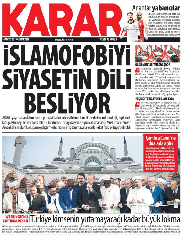 ABD’de yayımlanan İslamofobi raporunu kaynak gösteren Karar gazetesi, dev bir başlık atarak “İslamofobiyi siyasetin dili besliyor” ifadelerini kullandı. Gazete, haberin ayrıntılarını başlığın altı yerine başlığın yanına taşıyarak oluşturduğu özel alana ise Cumhurbaşkanı Erdoğan’ın Büyük Çamlıca Camisi’nin açılış törenini koydu. Gazetenin, Erdoğan fotoğrafını manşet başlığı ile özdeşleştirmek için de açılış haberinin başlığını küçük puntolarla üstelik fotoğrafın altına attığı görülüyor.