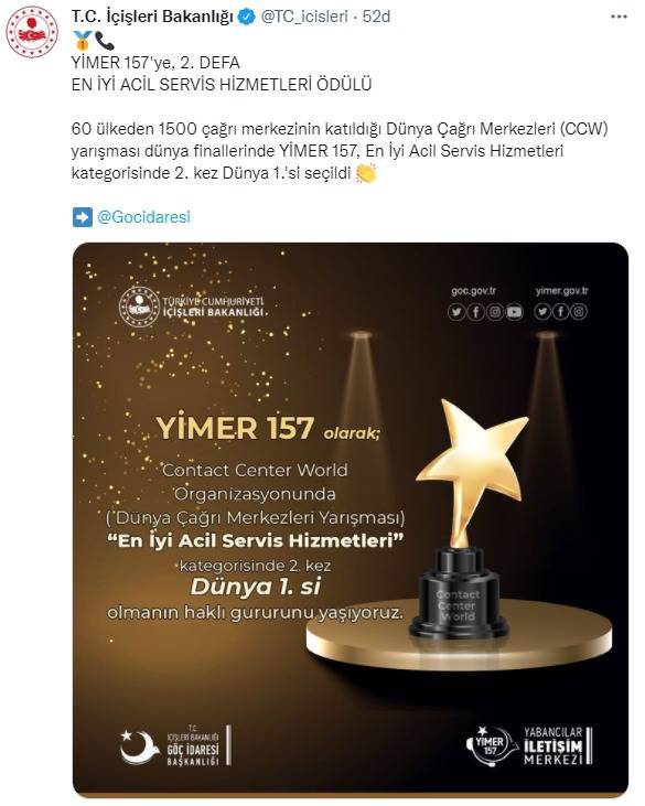 Konuya ilişkin İçişleri Bakanlığı resmi sosyal medya hesabından yapılan paylaşımda, “YİMER 157'ye, 2’nci defa en iyi acil servis hizmetleri ödülü verildi. 60 ülkeden 1500 çağrı merkezinin katıldığı Dünya Çağrı Merkezleri (CCW) yarışması dünya finallerinde YİMER 157, En İyi Acil Servis Hizmetleri kategorisinde 2’nci kez Dünya 1'incisi seçildi” ifadeleri kullanıldı.