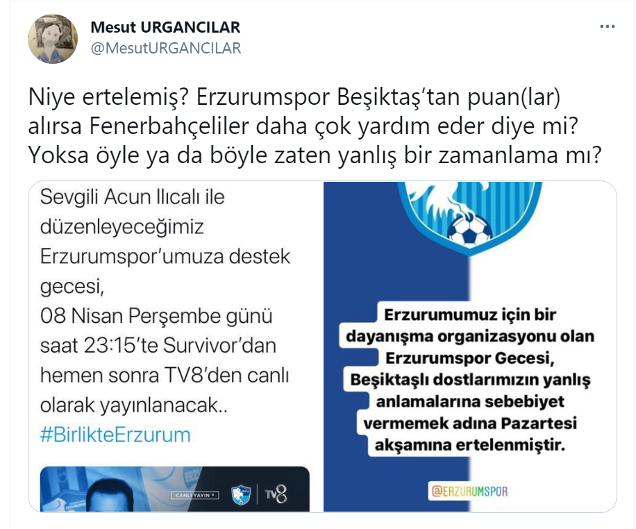 8 Nisan’da düzenlenmesi planlanan Erzurumspor’a deste gecesinin ertelenmesi Acun Ilıcalı ile Beşiktaş kulübü üyesi Mesut Urgancanlar arasında tartışma çıkardı. Urgancanlar, “Niye ertelemiş? Erzurumspor Beşiktaş’tan puan(lar) alırsa Fenerbahçeliler daha çok yardım eder diye mi? Yoksa öyle ya da böyle zaten yanlış bir zamanlama mı?” diye sordu.