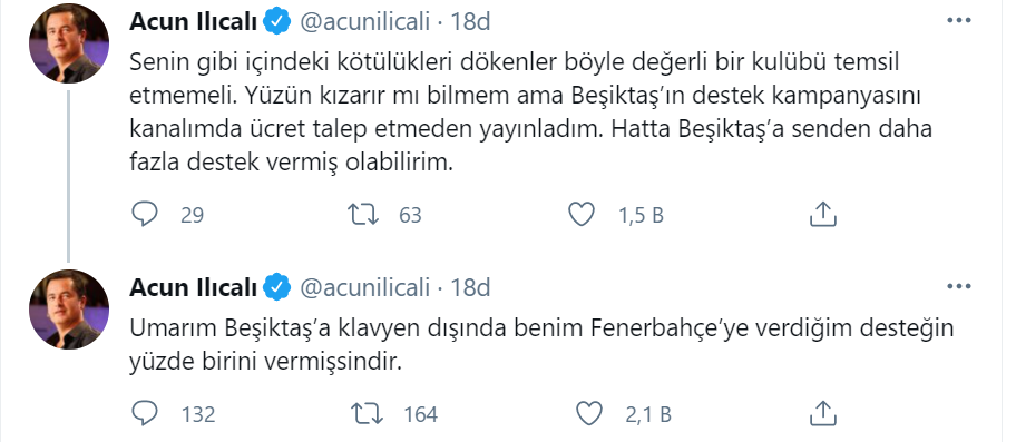 Hakkındaki iddialara sosyal medyadan cevap veren Acun, “Bize bu şekilde bir imayi yapacak kadar akıl tutulması yaşaman ilginç. Beşiktaşlı dostlarımız yanlış anlamasın diye planlanan Erzurumspor gecesini erteledik. Dominik’ten yayın yapmak zorunda kalacağız. Senin gibi içindeki kötülükleri dökenler böyle değerli bir kulübü temsil etmemeli. Yüzün kızarır mı bilmem ama Beşiktaş’ın destek kampanyasını kanalımda ücret talep etmeden yayınladım. Hatta Beşiktaş’a senden daha fazla destek vermiş olabilirim. Umarım Beşiktaş’a klavyen dışında benim Fenerbahçe’ye verdiğim desteğin yüzde birini vermişsindir.” ifadelerini kulandı.